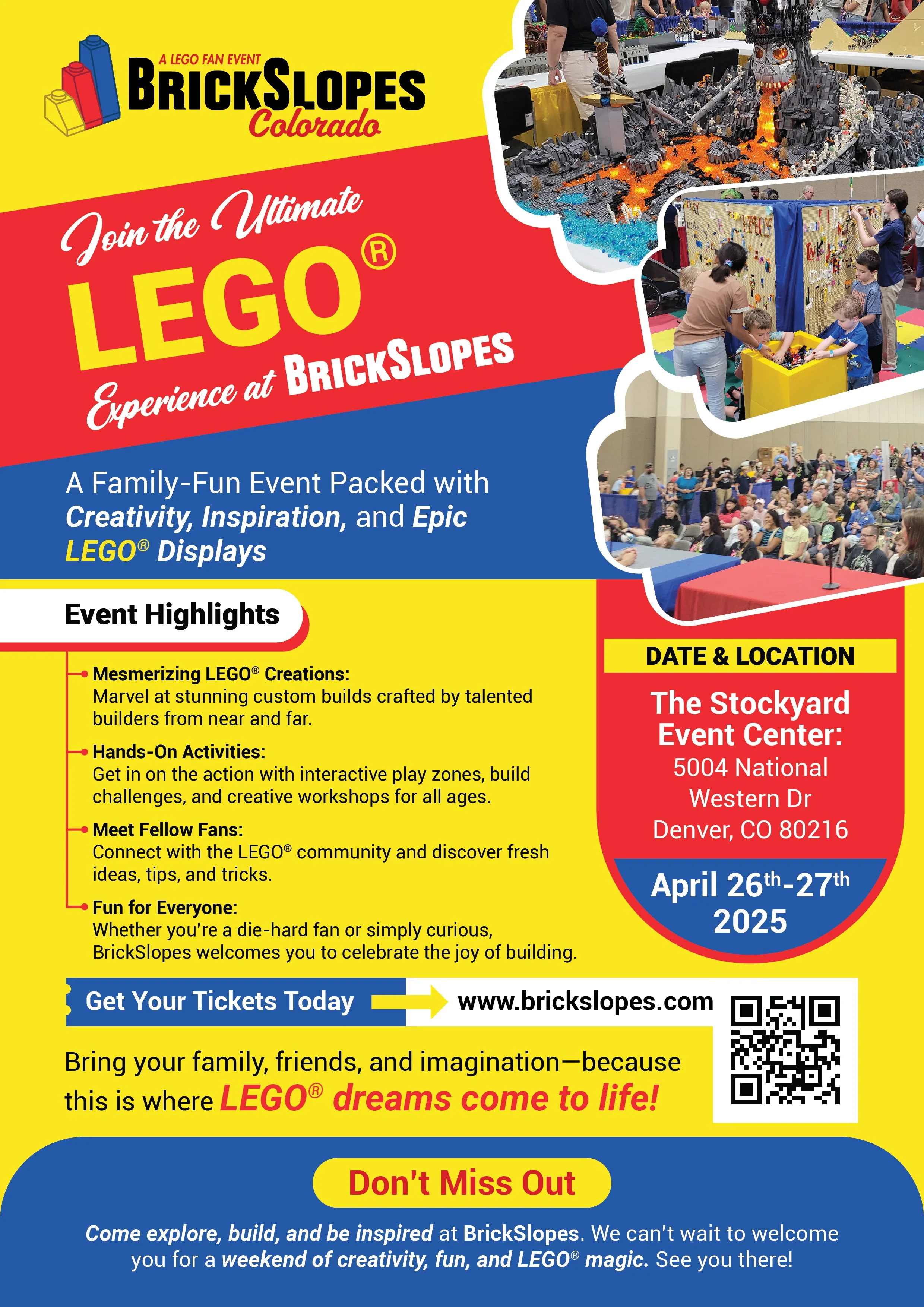 BrickSlopes is a Lego Fan Event where builders from all over the world come to Denver to show off their one of a kind creations built entirely with Lego. We invite the public in to see these amazing builds, vote for their favorite, meet Lego Masters from the hit T.V. show on Fox, shop Lego related vendors, play in a 3 ton Lego brick pit, race cars, and so much more! Come to Colorado's only locally owned and operated Lego fan event.