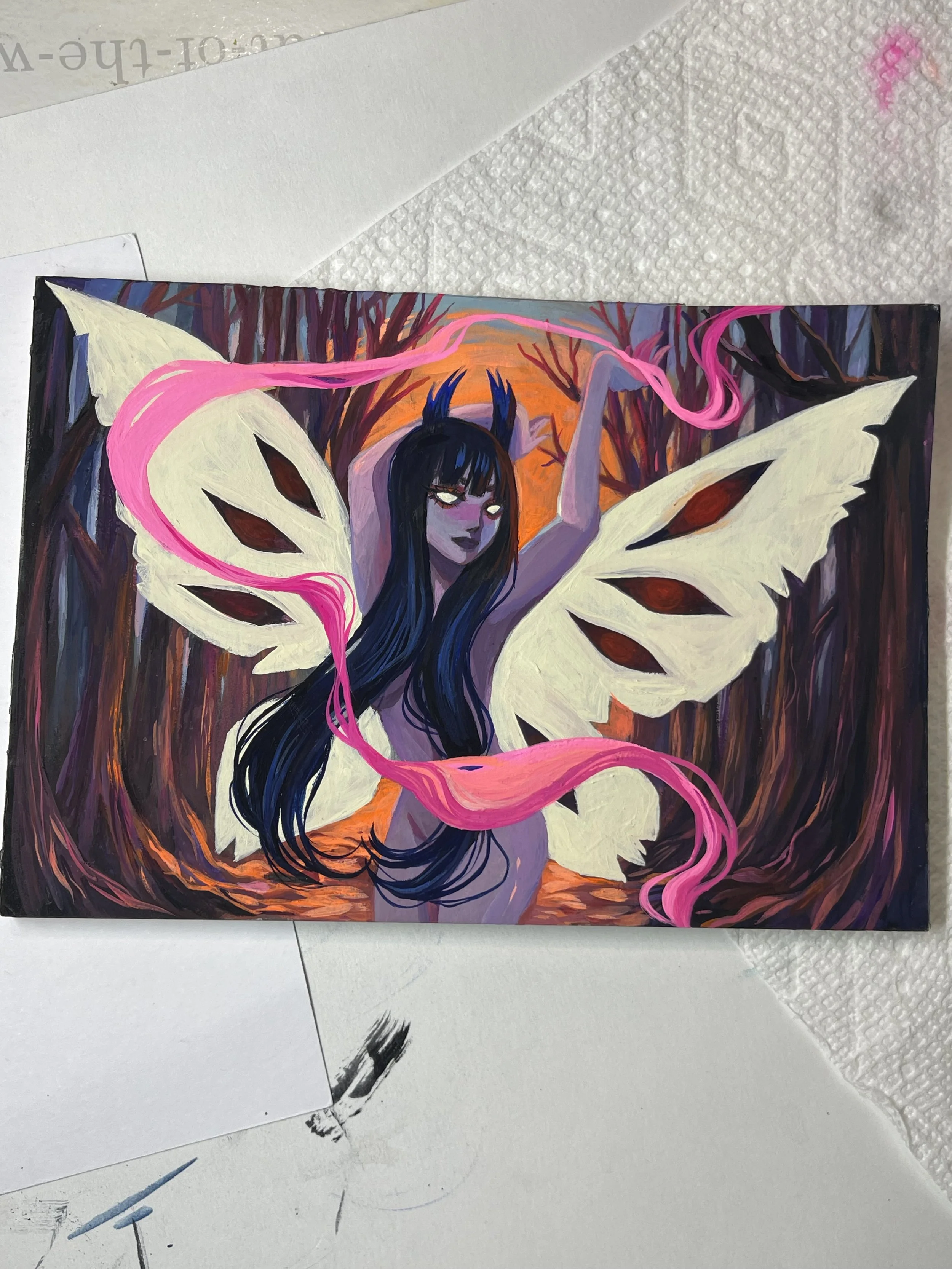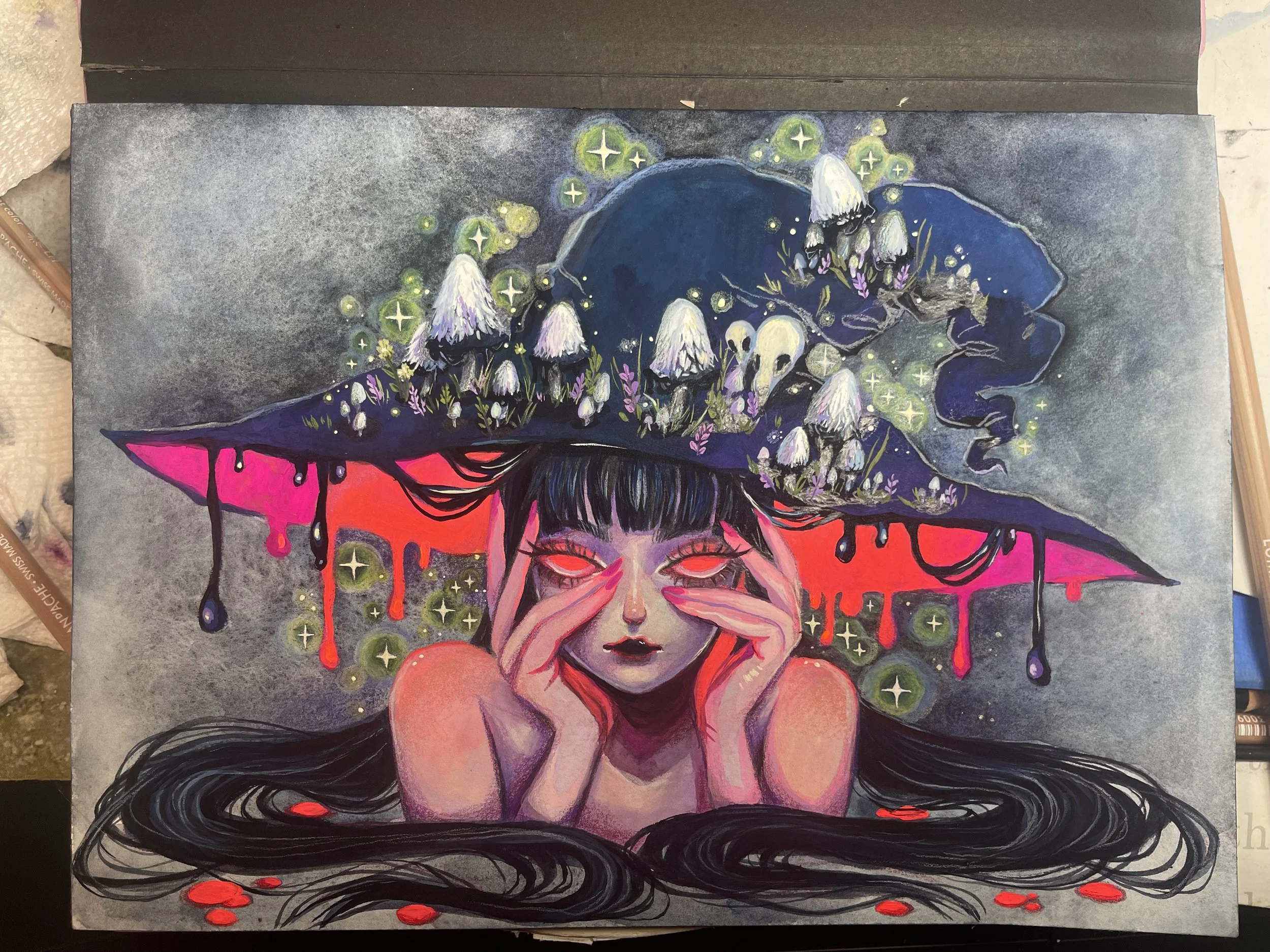 Lavendercat is a Denver-based gouache artist celebrated for her vibrant, whimsical portraits that blend beauty and mystery. Her work features ethereal, eerie figures brought to life with striking color contrasts and a unique sense of duality, exploring themes like light and dark or order and chaos.