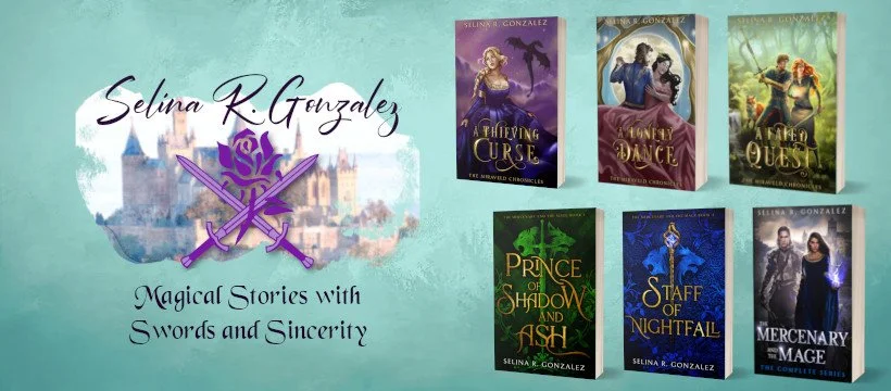 Romantic fantasy author Selina R. Gonzalez has published ten fantasy novels, including A Thieving Curse, which was a top-5 Finalist for the Readers Choice Realm Award for speculative fiction in 2021. She was born and raised in Colorado and has mountains in her blood and dreams that top 14,000 feet. She loves swords (including lightsabers), costumes, C-dramas and K-dramas, bread, medieval history, superheroes, faux leather, things that sparkle, snark, dogs, and Jesus—not in that order. Selina writes about magic, castles, mythical creatures, flawed but noble heroes, dastardly villains, hope in darkness, the value of each person, and love—between family, found family, friends, and couples, with a focus on healthy, non-toxic M/F romance.